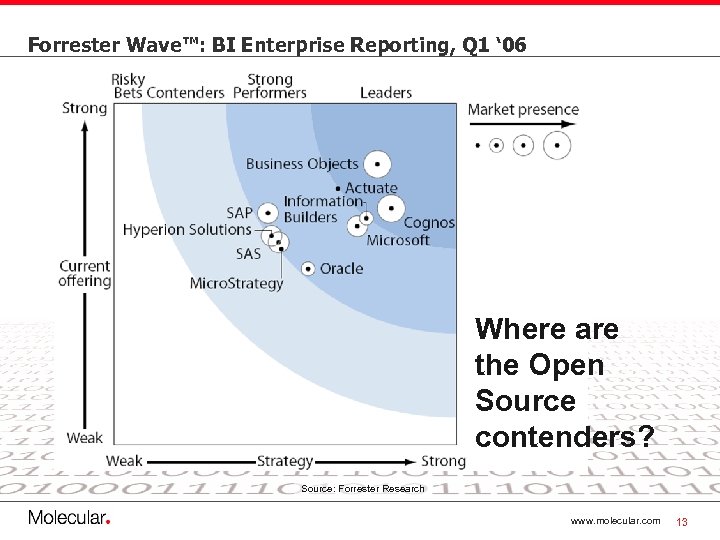 Forrester Wave™: BI Enterprise Reporting, Q 1 ‘ 06 Where are the Open Source contenders? Source: Forrester Research www. molecular. com 13