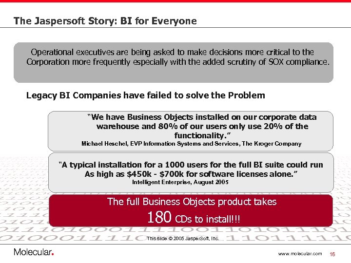 The Jaspersoft Story: BI for Everyone Operational executives are being asked to make decisions more critical to the Corporation more frequently especially with the added scrutiny of SOX compliance. Legacy BI Companies have failed to solve the Problem “We have Business Objects installed on our corporate data warehouse and 80% of our users only use 20% of the functionality. ” Michael Heschel, EVP Information Systems and Services, The Kroger Company “A typical installation for a 1000 users for the full BI suite could run As high as $450 k - $700 k for software licenses alone. ” Intelligent Enterprise, August 2005 The full Business Objects product takes 180 CDs to install!!! This slide © 2005 Jasper. Soft, Inc. www. molecular. com 16