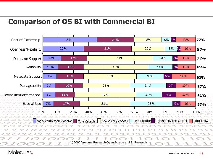 Organizational Involvement with OS BI Don’t Know Not Considering open source BI software 9% 8% 43% Considering open source BI software Has deployed open source BI software 21% 19% In development with open source BI software (c) 2006 Ventana Research Open Source and BI Research www. molecular. com 17