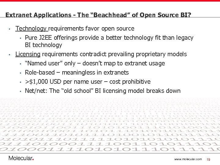 Extranet Applications - The “Beachhead” of Open Source BI? Technology requirements favor open source • Pure J 2 EE offerings provide a better technology fit than legacy BI technology • Licensing requirements contradict prevailing proprietary models • “Named user” only – doesn’t map to extranet usage • Role-based – meaningless in extranets • >$1, 000 USD per name user – cost prohibitive • Net/net: The “old school” BI licensing model breaks down • www. molecular. com 19