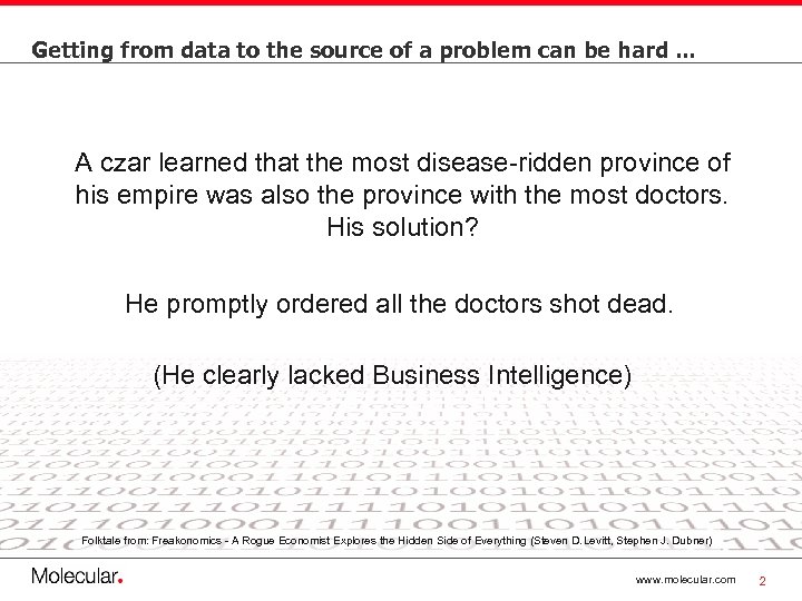 Getting from data to the source of a problem can be hard. . . A czar learned that the most disease-ridden province of his empire was also the province with the most doctors. His solution? He promptly ordered all the doctors shot dead. (He clearly lacked Business Intelligence) Folktale from: Freakonomics - A Rogue Economist Explores the Hidden Side of Everything (Steven D. Levitt, Stephen J. Dubner) www. molecular. com 2