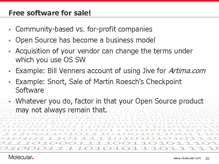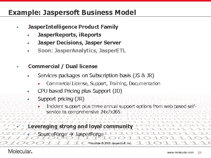 Free software for sale! • • • Community-based vs. for-profit companies Open Source has become a business model Acquisition of your vendor can change the terms under which you use OS SW Example: Bill Venners account of using Jive for Artima. com Example: Snort, Sale of Martin Roesch’s Checkpoint Software Whatever you do, factor in that your Open Source product may not always remain that. www. molecular. com 20