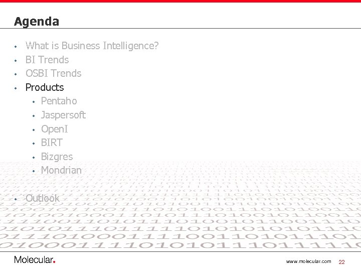 Agenda What is Business Intelligence? • BI Trends • OSBI Trends • Products • Pentaho • Jaspersoft • Open. I • BIRT • Bizgres • Mondrian • • Outlook www. molecular. com 22