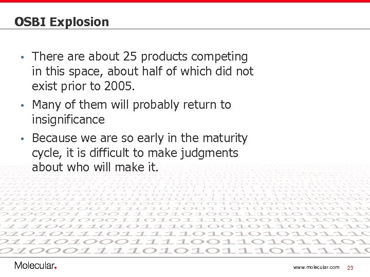 OSBI Explosion There about 25 products competing in this space, about half of which did not exist prior to 2005. • Many of them will probably return to insignificance • Because we are so early in the maturity cycle, it is difficult to make judgments about who will make it. • www. molecular. com 23