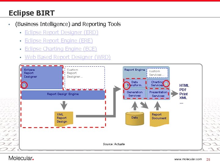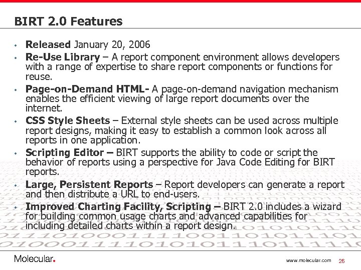 Eclipse BIRT • (Business Intelligence) and Reporting Tools Eclipse Report Designer (ERD) • Eclipse Report Engine (ERE) • Eclipse Charting Engine (ECE) • Web Based Report Designer (WRD) • Source: Actuate www. molecular. com 25