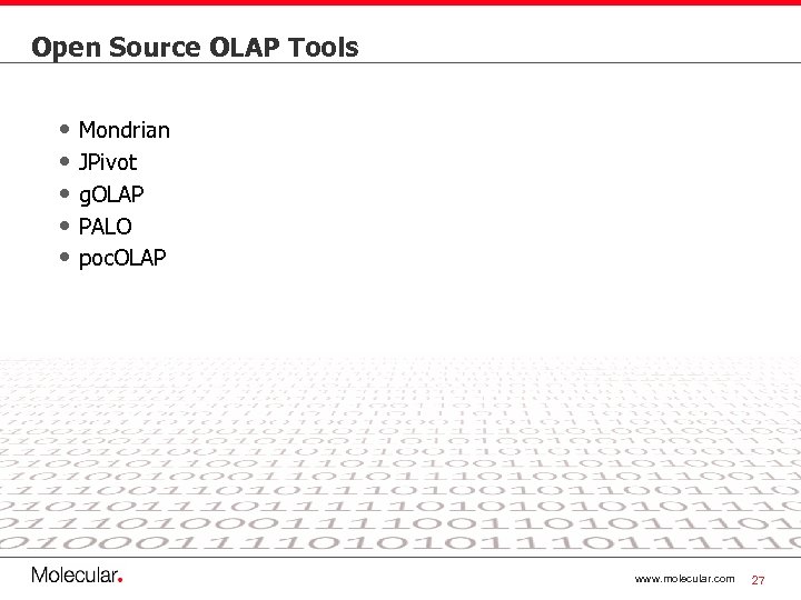 Open Source OLAP Tools • • • Mondrian JPivot g. OLAP PALO poc. OLAP www. molecular. com 27