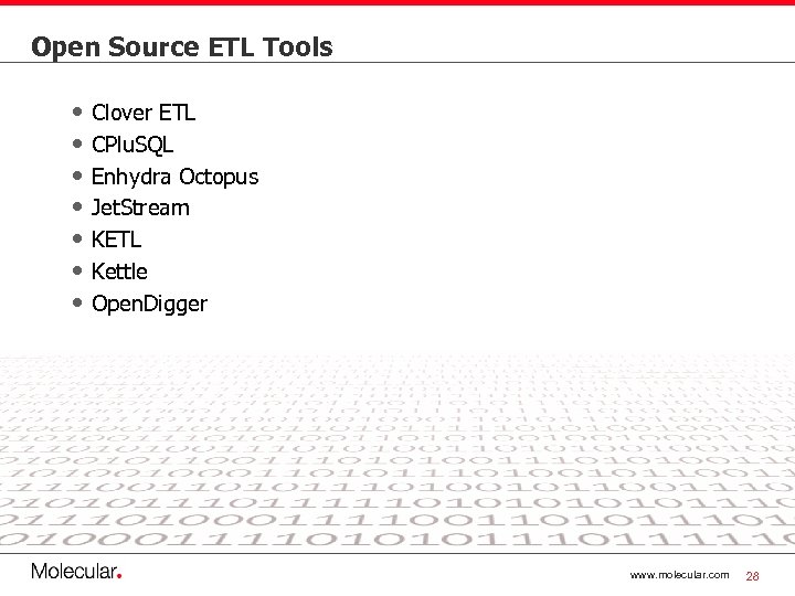 Open Source ETL Tools • • Clover ETL CPlu. SQL Enhydra Octopus Jet. Stream KETL Kettle Open. Digger www. molecular. com 28