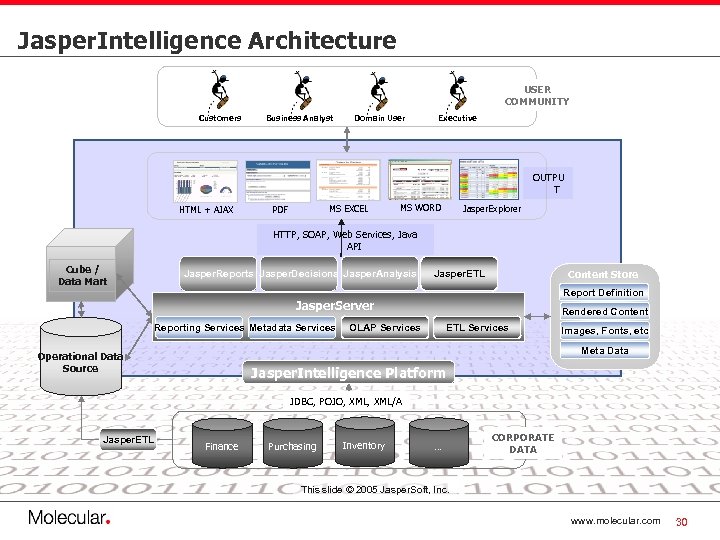 Jasper. Intelligence Architecture USER COMMUNITY Customers Business Analyst Domain User Executive OUTPU T HTML + AJAX MS EXCEL PDF MS WORD Jasper. Explorer HTTP, SOAP, Web Services, Java API Cube / Data Mart Jasper. Reports Jasper. Decisions Jasper. Analysis Jasper. ETL Content Store Report Definition Jasper. Server Reporting Services Metadata Services Rendered Content OLAP Services ETL Services Images, Fonts, etc Meta Data Operational Data Source Jasper. Intelligence Platform JDBC, POJO, XML/A Jasper. ETL Finance Purchasing Inventory … CORPORATE DATA This slide © 2005 Jasper. Soft, Inc. www. molecular. com 30