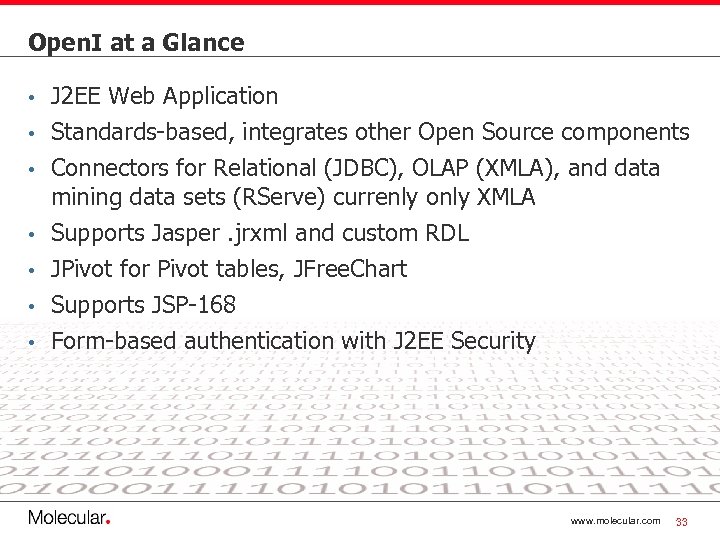 Open. I at a Glance • J 2 EE Web Application Standards-based, integrates other Open Source components Connectors for Relational (JDBC), OLAP (XMLA), and data mining data sets (RServe) currenly only XMLA Supports Jasper. jrxml and custom RDL JPivot for Pivot tables, JFree. Chart Supports JSP-168 • Form-based authentication with J 2 EE Security • • • www. molecular. com 33