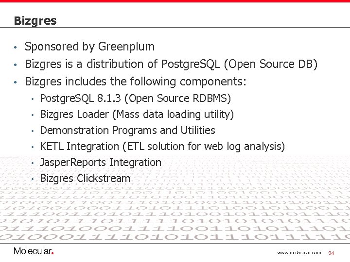Bizgres Sponsored by Greenplum • Bizgres is a distribution of Postgre. SQL (Open Source DB) • Bizgres includes the following components: • • Postgre. SQL 8. 1. 3 (Open Source RDBMS) Bizgres Loader (Mass data loading utility) Demonstration Programs and Utilities KETL Integration (ETL solution for web log analysis) Jasper. Reports Integration • Bizgres Clickstream • • www. molecular. com 34