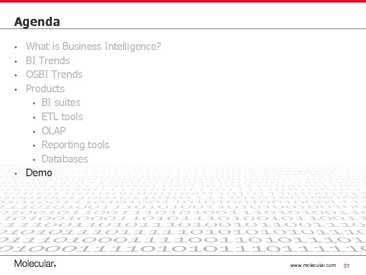 Agenda • • • What is Business Intelligence? BI Trends OSBI Trends Products • BI suites • ETL tools • OLAP • Reporting tools • Databases Demo www. molecular. com 37