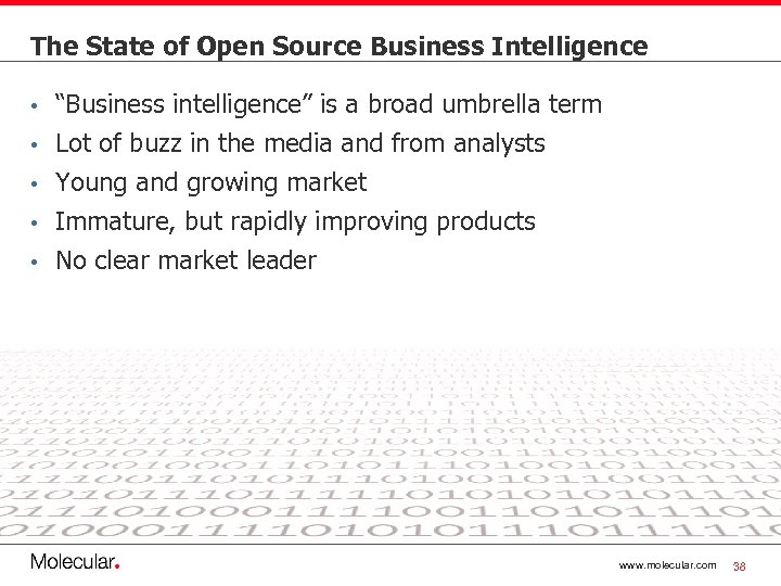 The State of Open Source Business Intelligence “Business intelligence” is a broad umbrella term • Lot of buzz in the media and from analysts • Young and growing market • Immature, but rapidly improving products • No clear market leader • www. molecular. com 38
