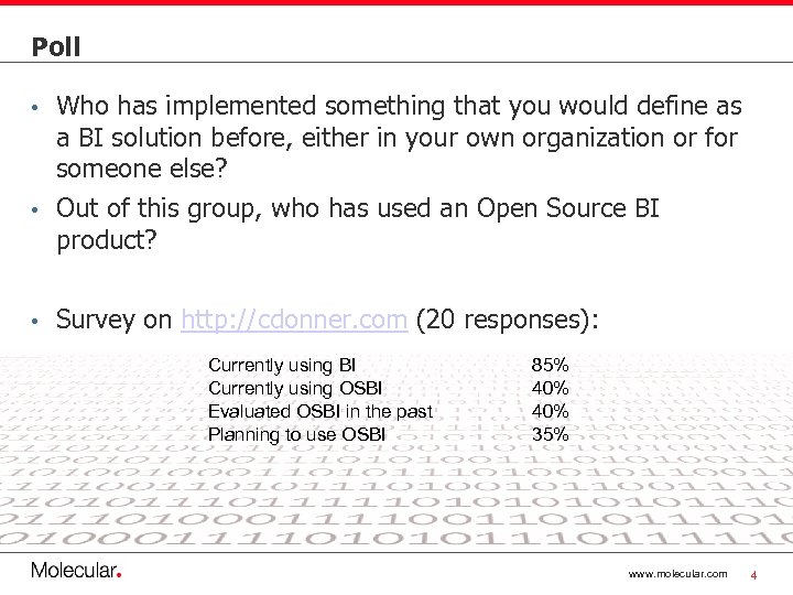 Poll Who has implemented something that you would define as a BI solution before, either in your own organization or for someone else? • Out of this group, who has used an Open Source BI product? • • Survey on http: //cdonner. com (20 responses): Currently using BI Currently using OSBI Evaluated OSBI in the past Planning to use OSBI 85% 40% 35% www. molecular. com 4