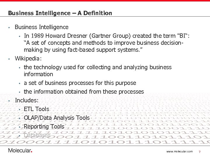 Agenda • • • What is Business Intelligence? BI Trends OSBI Trends Products • Pentaho • Jaspersoft • Open. I • BIRT • Bizgres • Mondrian Demo www. molecular. com 6