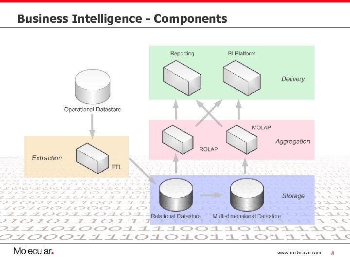 Business Intelligence – A Definition Business Intelligence • In 1989 Howard Dresner (Gartner Group) created the term "BI“: “A set of concepts and methods to improve business decisionmaking by using fact-based support systems. ” • Wikipedia: • the technology used for collecting and analyzing business information • a set of business processes for this purpose • the information obtained from these processes • Includes: • ETL Tools • OLAP/Data Analysis Tools • Reporting Tools • Databases • www. molecular. com 7