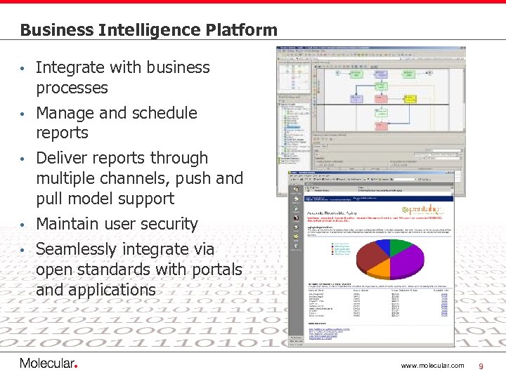 Business Intelligence Platform Integrate with business processes • Manage and schedule reports • Deliver reports through multiple channels, push and pull model support • Maintain user security • • Seamlessly integrate via open standards with portals and applications www. molecular. com 9