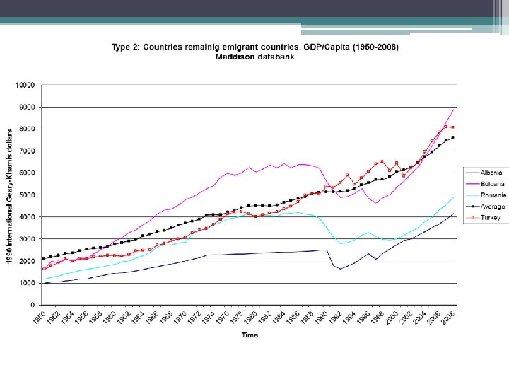 South Eastern Europe and global inequalities: long term perspective • Eastern and South Eastern Europe has not really changed its position for the last 100 and 150 years even across political regimes. Use of proxies when data is not available (Good and Tongshou 1999) • Global comparative and historical statistics: Maddison database. Use of 1990 Geary-Khamis USD and rely on purchasing power parities rather than exchange rates. Projects back and forward these 1990 levels of GDP with indexes checked by specialists • The differentials are almost the same throughout: makes migration all the time „rational” and makes the already existing links „viable”:
