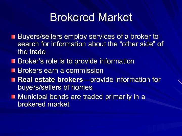 Brokered Market Buyers/sellers employ services of a broker to search for information about the “other side” of the trade Broker’s role is to provide information Brokers earn a commission Real estate brokers—provide information for buyers/sellers of homes Municipal bonds are traded primarily in a brokered market