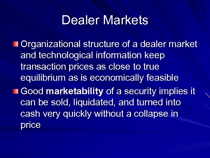 Dealer Markets Organizational structure of a dealer market and technological information keep transaction prices as close to true equilibrium as is economically feasible Good marketability of a security implies it can be sold, liquidated, and turned into cash very quickly without a collapse in price