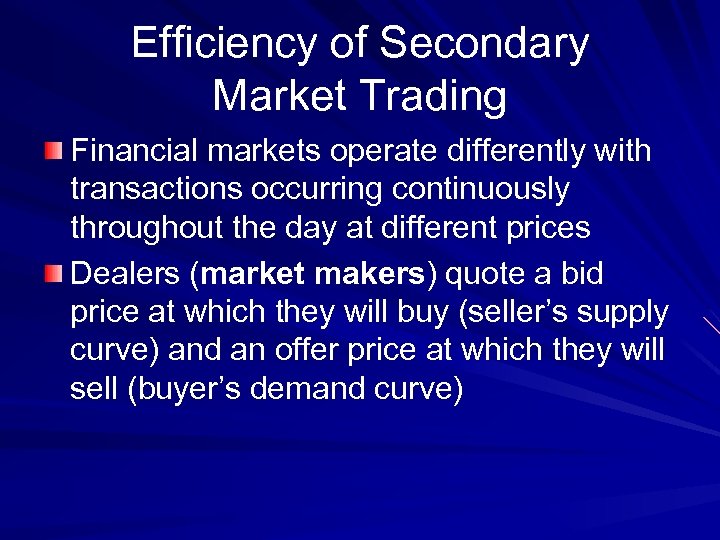 Efficiency of Secondary Market Trading Financial markets operate differently with transactions occurring continuously throughout the day at different prices Dealers (market makers) quote a bid price at which they will buy (seller’s supply curve) and an offer price at which they will sell (buyer’s demand curve)
