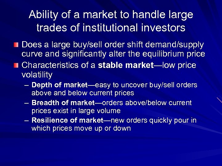 Ability of a market to handle large trades of institutional investors Does a large buy/sell order shift demand/supply curve and significantly alter the equilibrium price Characteristics of a stable market—low price volatility – Depth of market—easy to uncover buy/sell orders above and below current prices – Breadth of market—orders above/below current prices exist in large volume – Resilience of market—new orders quickly pour in which prices move up or down
