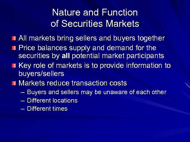 Nature and Function of Securities Markets All markets bring sellers and buyers together Price balances supply and demand for the securities by all potential market participants Key role of markets is to provide information to buyers/sellers Markets reduce transaction costs – Buyers and sellers may be unaware of each other – Different locations – Different times