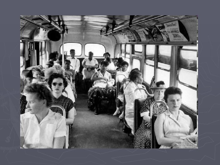 Rosa Parks ► In Alabama, the bus company had a rule that said all African-Americans had to sit in the back of the bus. ► In 1955, Rosa Parks, an African-American women, was coming home from work and was very tired. The seats in the back were full, but the front seats were empty. She sat down in the front. When the bus driver ordered her to move, she refused. He called the police and they arrested her.