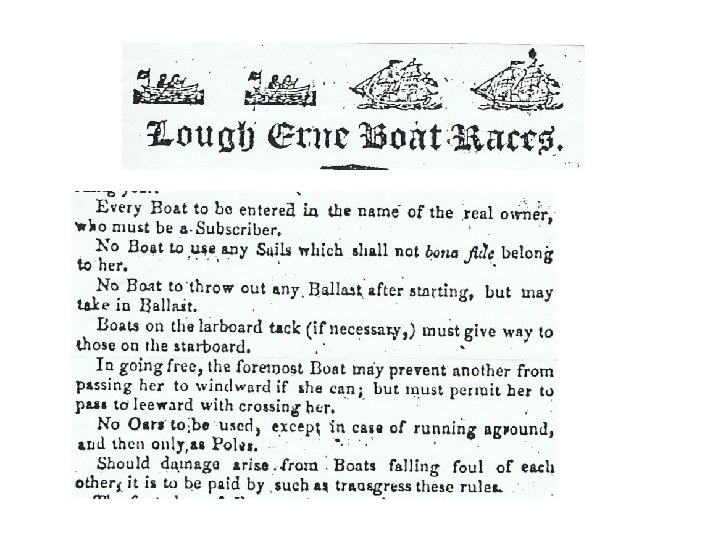 Rusclare, Start, Course, Finish Rossclare Green – hilltop spectator view over whole race area Start boats anchored in line – copied from horse racing Stewarts – horse racing term - HQ on Inishdoney island Finish marked by a POST BOAT - horse racing terminology Rules written by William D’Arcy Irvine, Necarne Castle, Irvinestown He also organised horse racing Earliest surviving full set of published regatta documents?
