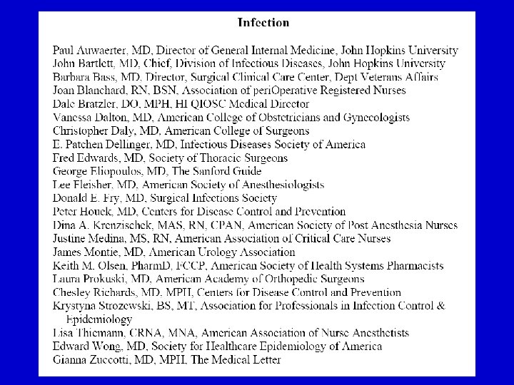 Antibiotic Recommendation Sources • American Society of Health System Pharmacists • Infectious Diseases Society of America • The Hospital Infection Control Practices Advisory Committee • Medical Letter • Surgical Infection Society • Sanford Guide to Antimicrobial Therapy • The Johns Hopkins Guide • Society of Thoracic Surgeons