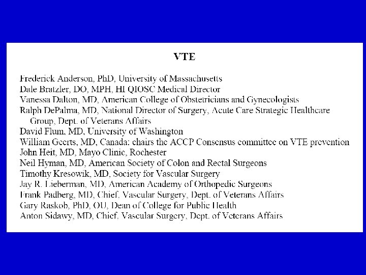 National Body Position Statements • Leapfrog 1: PE is “the most common preventable cause of hospital death in the United States” • Agency for Healthcare Research and Quality (AHRQ)2: Thromboprophylaxis is the number 1 patient safety practice • American Public Health Association (APHA)3: “The disconnect between evidence and execution as it relates to DVT prevention amounts to a public health crisis. ” 1. 2. 3. The Leapfrog Group Hospital Quality and Safety Survey. Available at: www. leapfrog. medstat. com/pdf/Final/doc Shojania KG, et al. Making Healthcare Safer: A Critical Analysis of Patient Safety Practices. AHRQ, 2001. Available at: www. ahrq. gov/clinic/ptsafety/ White Paper. Deep-vein thrombosis: Advancing awareness to protect patient lives. 2003. Available at: www. alpha. org/ppp/DVT_White_Paper. pdf