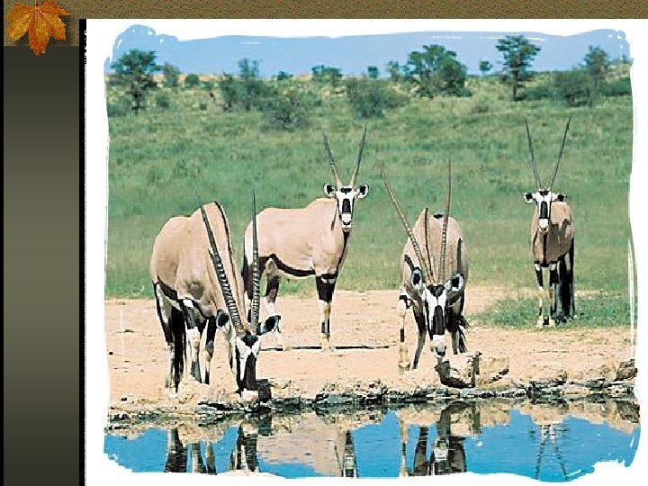 Water n Many animals drink water every day from water holes, ponds, lakes, rivers, & streams. n Few animals rarely drink because they get their water from seeds, leaves, or pulp of a plant. (Ex: Koalas never drink. )