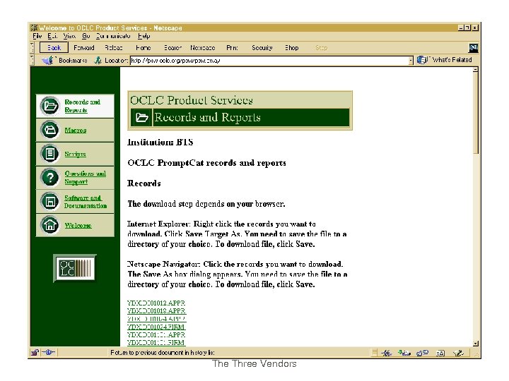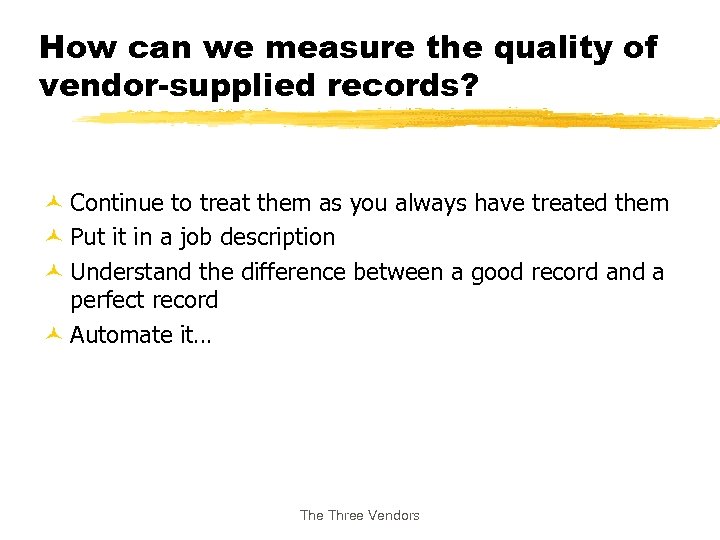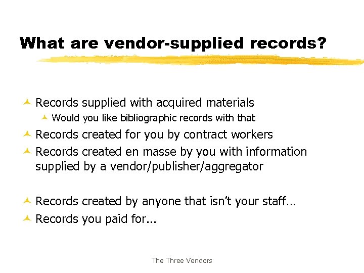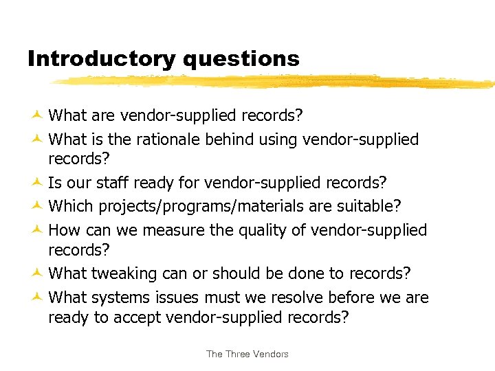 Introductory questions © What are vendor-supplied records? © What is the rationale behind using vendor-supplied records? © Is our staff ready for vendor-supplied records? © Which projects/programs/materials are suitable? © How can we measure the quality of vendor-supplied records? © What tweaking can or should be done to records? © What systems issues must we resolve before we are ready to accept vendor-supplied records? The Three Vendors