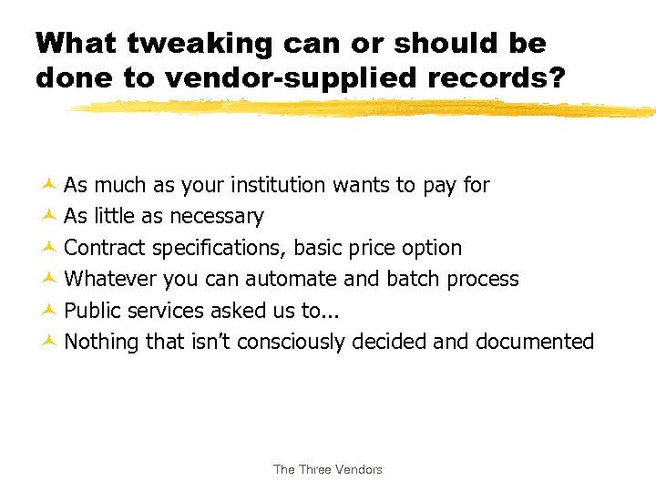 What tweaking can or should be done to vendor-supplied records? © As much as your institution wants to pay for © As little as necessary © Contract specifications, basic price option © Whatever you can automate and batch process © Public services asked us to. . . © Nothing that isn’t consciously decided and documented The Three Vendors
