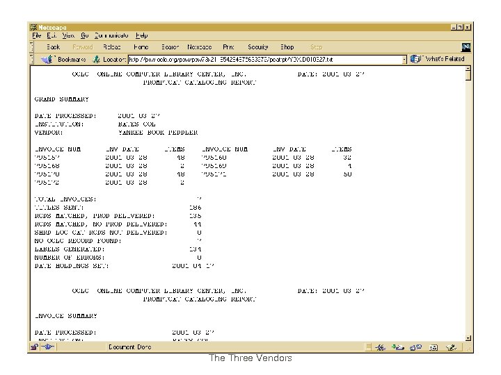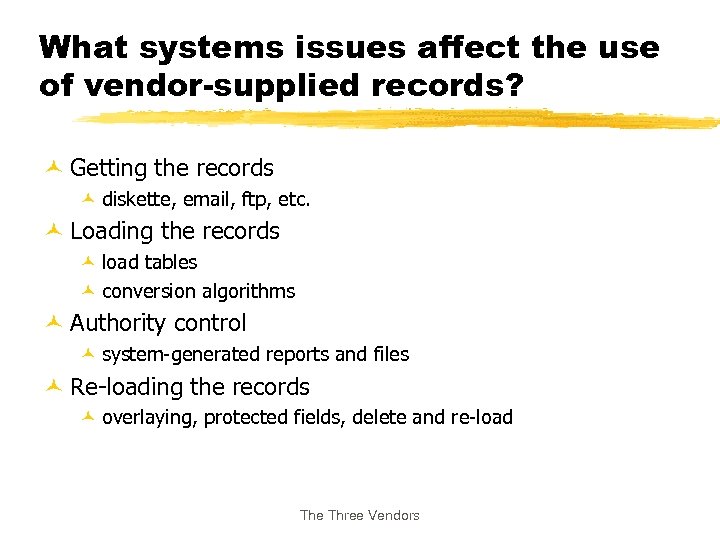 What systems issues affect the use of vendor-supplied records? © Getting the records © diskette, email, ftp, etc. © Loading the records © load tables © conversion algorithms © Authority control © system-generated reports and files © Re-loading the records © overlaying, protected fields, delete and re-load The Three Vendors