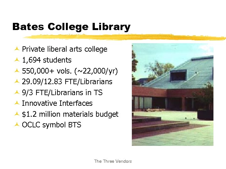 Bates College Library © Private liberal arts college © 1, 694 students © 550, 000+ vols. (~22, 000/yr) © 29. 09/12. 83 FTE/Librarians © 9/3 FTE/Librarians in TS © Innovative Interfaces © $1. 2 million materials budget © OCLC symbol BTS The Three Vendors