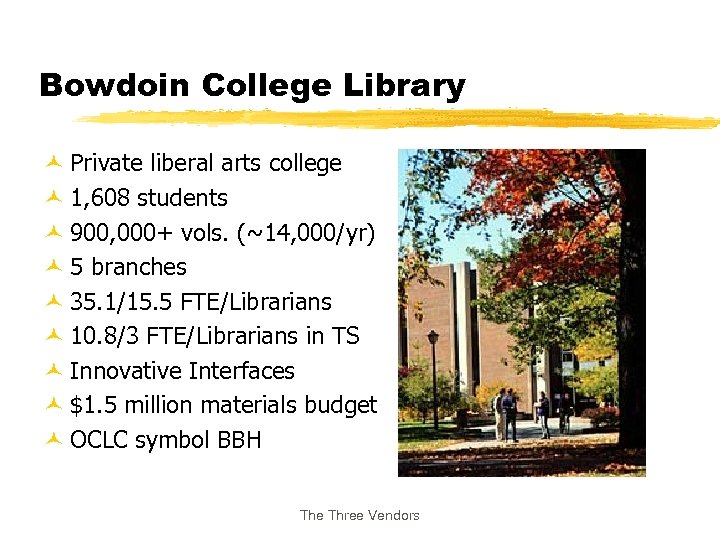 Bowdoin College Library © Private liberal arts college © 1, 608 students © 900, 000+ vols. (~14, 000/yr) © 5 branches © 35. 1/15. 5 FTE/Librarians © 10. 8/3 FTE/Librarians in TS © Innovative Interfaces © $1. 5 million materials budget © OCLC symbol BBH The Three Vendors