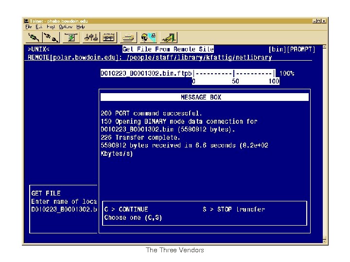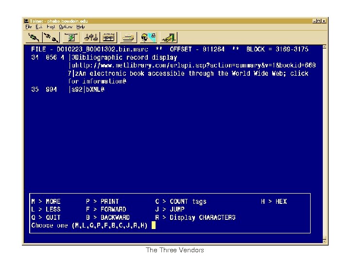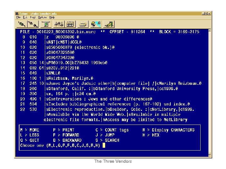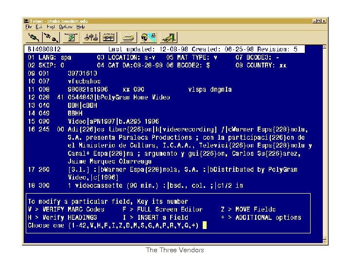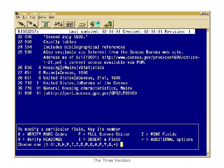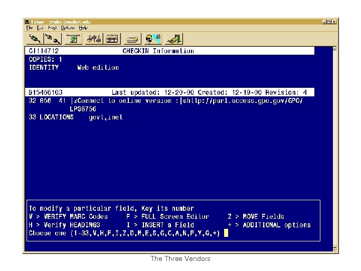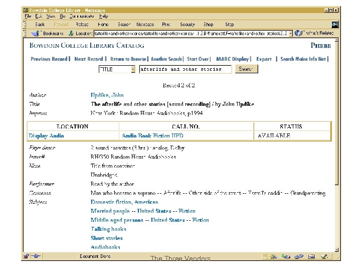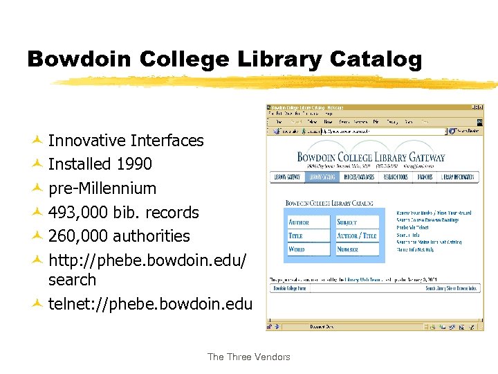 Bowdoin College Library Catalog © Innovative Interfaces © Installed 1990 © pre-Millennium © 493, 000 bib. records © 260, 000 authorities © http: //phebe. bowdoin. edu/ search © telnet: //phebe. bowdoin. edu The Three Vendors