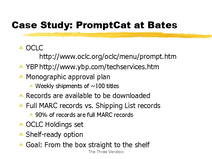 Case Study: Prompt. Cat at Bates © OCLC http: //www. oclc. org/oclc/menu/prompt. htm © YBP http: //www. ybp. com/techservices. htm © Monographic approval plan © Weekly shipments of ~100 titles © Records are available to be downloaded © Full MARC records vs. Shipping List records © 90% of records are full MARC records © OCLC Holdings set © Shelf-ready option © Goal: From the box straight to the shelf The Three Vendors