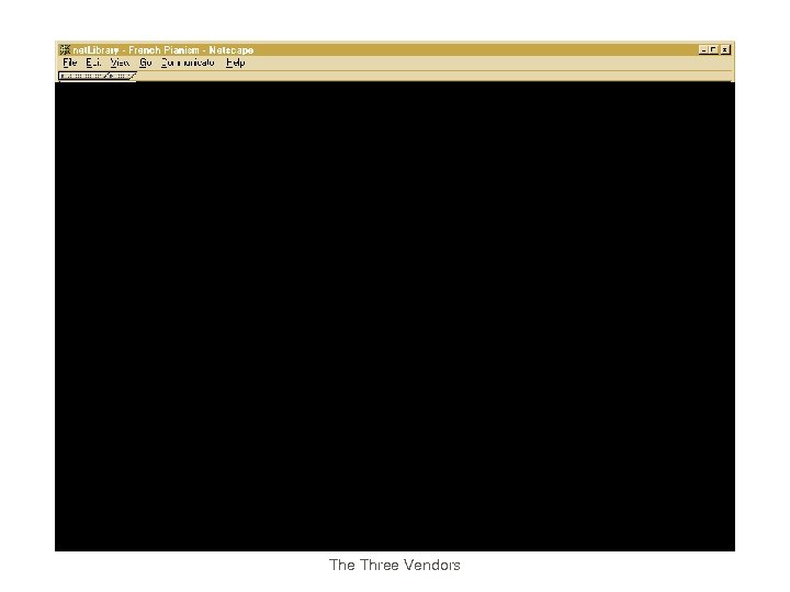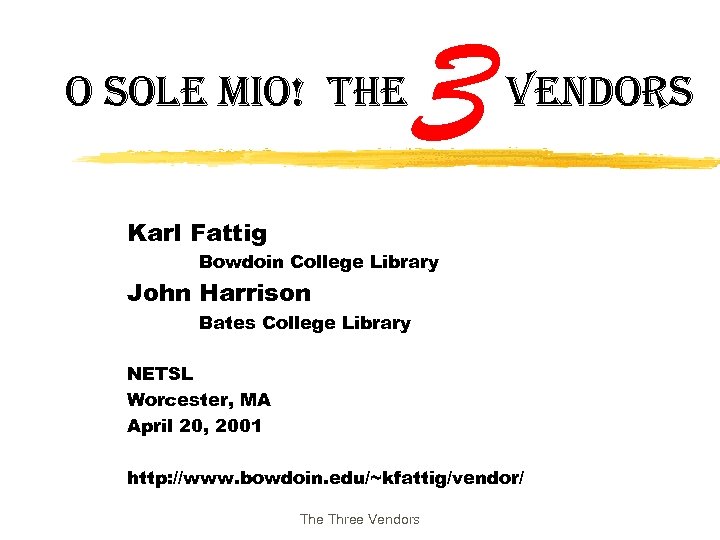 o sole Mio! The 3 Vendors Karl Fattig Bowdoin College Library John Harrison Bates College Library NETSL Worcester, MA April 20, 2001 http: //www. bowdoin. edu/~kfattig/vendor/ The Three Vendors