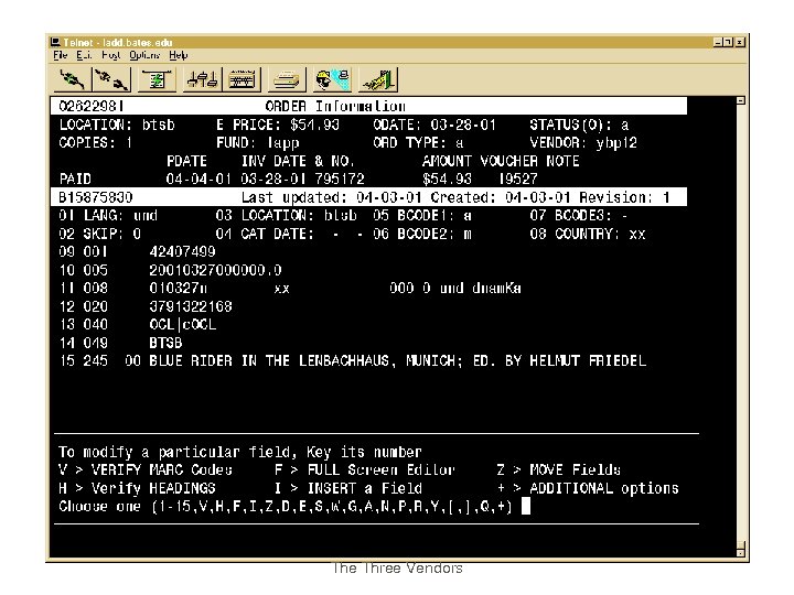 Bates College Library Catalog © Innovative Interfaces © Installed 1990 © pre-Millennium © 498, 400 bib. records © 332, 800 authorities © http: //ladd. bates. edu/search © telnet: //ladd. bates. edu The Three Vendors