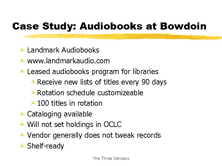 Case Study: Audiobooks at Bowdoin © Landmark Audiobooks © www. landmarkaudio. com © Leased audiobooks program for libraries ©Receive new lists of titles every 90 days ©Rotation schedule customizeable © 100 titles in rotation © Cataloging available © Will not set holdings in OCLC © Vendor generally does not tweak records © Shelf-ready The Three Vendors