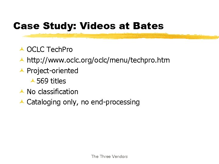 Case Study: Videos at Bates © OCLC Tech. Pro © http: //www. oclc. org/oclc/menu/techpro. htm © Project-oriented © 569 titles © No classification © Cataloging only, no end-processing The Three Vendors