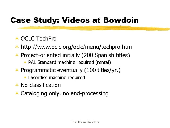 Case Study: Videos at Bowdoin © OCLC Tech. Pro © http: //www. oclc. org/oclc/menu/techpro. htm © Project-oriented initially (200 Spanish titles) © PAL Standard machine required (rental) © Programmatic eventually (100 titles/yr. ) © Laserdisc machine required © No classification © Cataloging only, no end-processing The Three Vendors