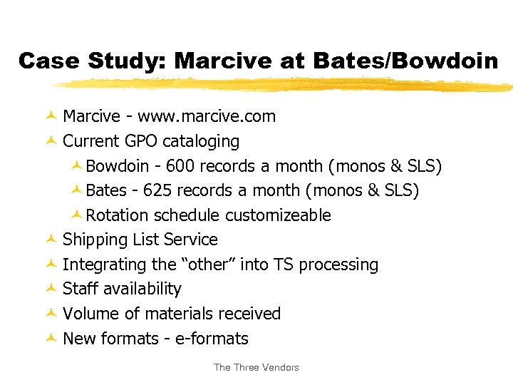 Case Study: Marcive at Bates/Bowdoin © Marcive - www. marcive. com © Current GPO cataloging ©Bowdoin - 600 records a month (monos & SLS) ©Bates - 625 records a month (monos & SLS) ©Rotation schedule customizeable © Shipping List Service © Integrating the “other” into TS processing © Staff availability © Volume of materials received © New formats - e-formats The Three Vendors