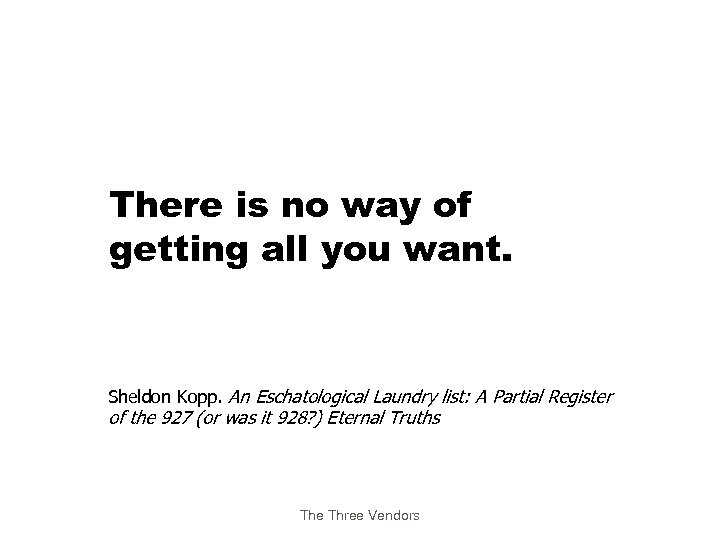 There is no way of getting all you want. Sheldon Kopp. An Eschatological Laundry list: A Partial Register of the 927 (or was it 928? ) Eternal Truths The Three Vendors