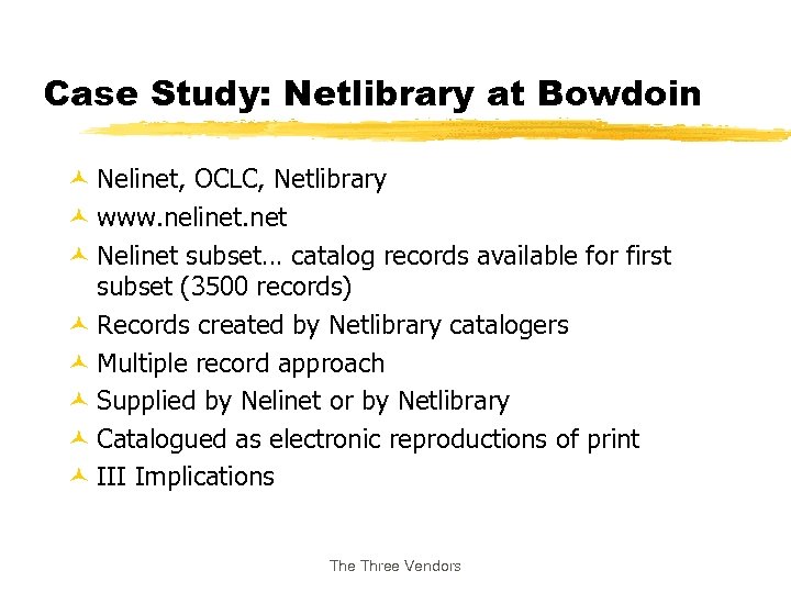 Case Study: Netlibrary at Bowdoin © Nelinet, OCLC, Netlibrary © www. nelinet. net © Nelinet subset… catalog records available for first subset (3500 records) © Records created by Netlibrary catalogers © Multiple record approach © Supplied by Nelinet or by Netlibrary © Catalogued as electronic reproductions of print © III Implications The Three Vendors