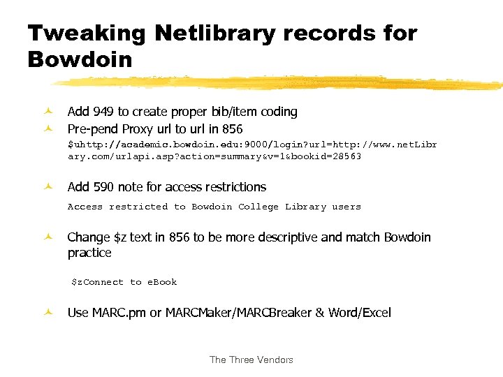 Tweaking Netlibrary records for Bowdoin © © Add 949 to create proper bib/item coding Pre-pend Proxy url to url in 856 $uhttp: //academic. bowdoin. edu: 9000/login? url=http: //www. net. Libr ary. com/urlapi. asp? action=summary&v=1&bookid=28563 © Add 590 note for access restrictions Access restricted to Bowdoin College Library users © Change $z text in 856 to be more descriptive and match Bowdoin practice $z. Connect to e. Book © Use MARC. pm or MARCMaker/MARCBreaker & Word/Excel The Three Vendors