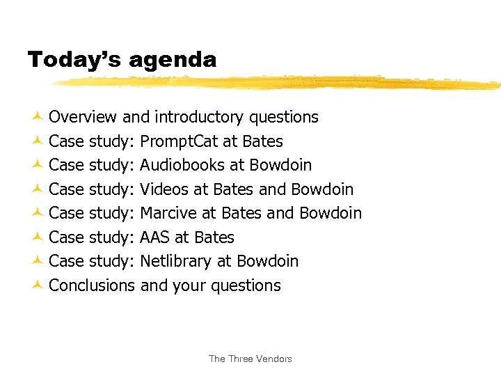 Today’s agenda © Overview and introductory questions © Case study: Prompt. Cat at Bates © Case study: Audiobooks at Bowdoin © Case study: Videos at Bates and Bowdoin © Case study: Marcive at Bates and Bowdoin © Case study: AAS at Bates © Case study: Netlibrary at Bowdoin © Conclusions and your questions The Three Vendors