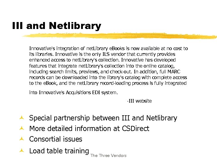 III and Netlibrary Innovative's integration of net. Library e. Books is now available at no cost to its libraries. Innovative is the only ILS vendor that currently provides enhanced access to net. Library's collection. Innovative has developed features that integrate net. Library's collection into the online catalog, including search limits, previews, and check-out. In addition, full MARC records can be downloaded into the library's catalog with complete access to the e. Book, and the net. Library record-loading process is fully integrated into Innovative's Acquisitions EDI system. -III website © Special partnership between III and Netlibrary © More detailed information at CSDirect © Consortial issues © Load table training The Three Vendors