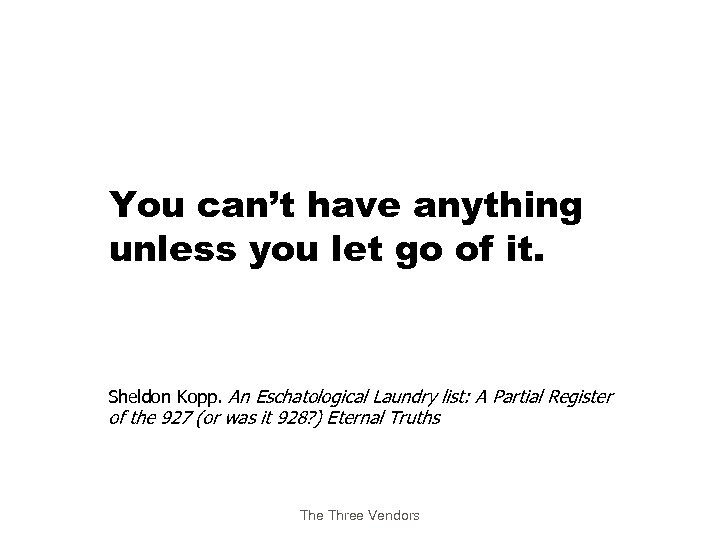 You can’t have anything unless you let go of it. Sheldon Kopp. An Eschatological Laundry list: A Partial Register of the 927 (or was it 928? ) Eternal Truths The Three Vendors